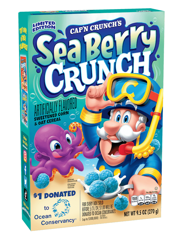 For every limited-time NEW Cap’n Crunch’s Sea Berry Crunch cereal box sold from December 18, 2023 to February 8, 2025, Cap’n Crunch will donate $1 to Ocean Conservancy (up to $500,000) to support their evidence-based approach to finding solutions for a healthy ocean and the wildlife that depends on it.